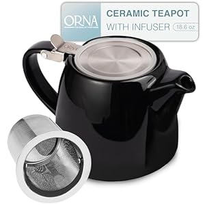 ORNA Ceramic Teapot with Tea Infuser – Small Tea Pot for Loose Leaf Tea – 550ml / 18.6 Oz Porcelain Non-Stove Teapot for 2 Cups with Tea Strainer (Black)