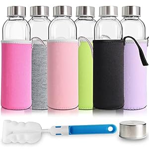 YEBODA Glass Water Bottles 18oz Bottles For Beverage and Juicer Use Stainless Steel Caps – Including Colorful Nylon Protection Sleeve,Pack Of 6
